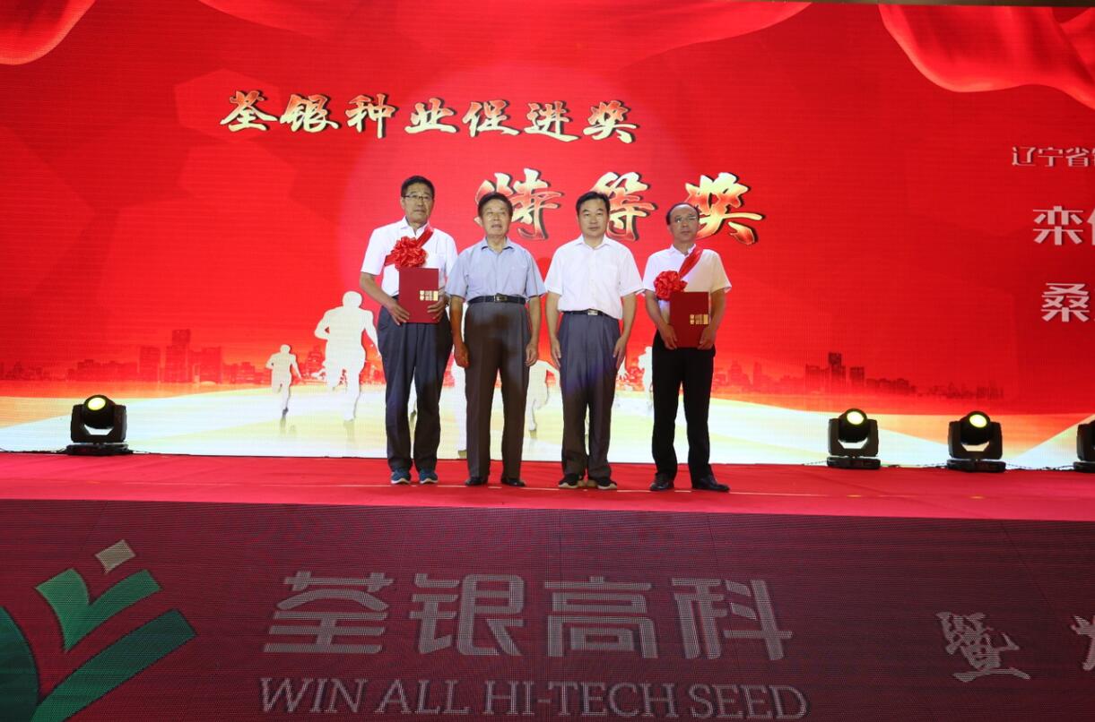 (中國種子協(xié)會副會長兼秘書長蔣協(xié)新與安徽張海銀種業(yè)基金會理事長張海銀為“荃銀種業(yè)促進(jìn)獎”特等獎獲得者鐵嶺市農(nóng)科院欒化泉研究員、桑立君研究員頒獎)