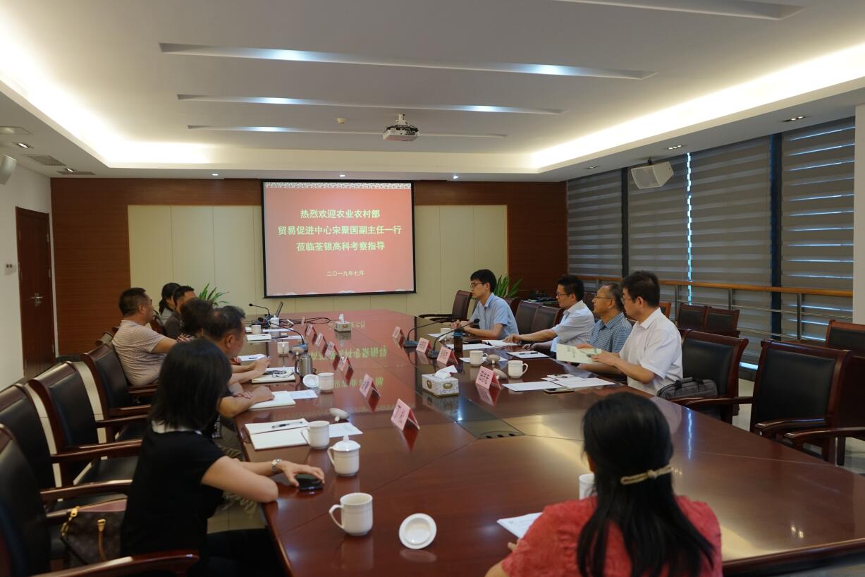 ??? 2019年7月9日,農(nóng)業(yè)農(nóng)村部農(nóng)業(yè)貿(mào)易促進(jìn)中心宋聚國(guó)副主任一行蒞臨荃銀高科調(diào)研指導(dǎo),省農(nóng)委外事外經(jīng)處處長(zhǎng)韋艾平、調(diào)研員閆玉平等陪同調(diào)研。荃銀高科副董事長(zhǎng)、總經(jīng)理張琴,副總經(jīng)理江三橋等熱情接待了宋聚國(guó)副主任一行。
